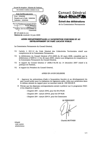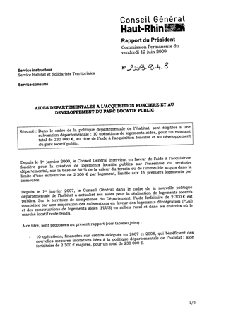 AIDES DEPARTEMENTALES A L'ACQUISITION FONCIERE ET AU DEVELOPPEMENT DU PARC LOCATIF PUBLIC Resumé Pièces jointes DELIBERATION RAPPORT Assemblée : Commission Permanente Date : 12/06/2009 Rapporteur : Non défini Collectivité : Conseil départemental du Haut-Rhin Direction : Non défini Service : Service Habitat et Solidarités Territoriales Domaine : Habitat Commission : Commission Permanente