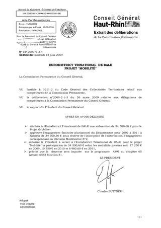 Le présent rapport a pour objet d'attribuer à l'Eurodistrict Trinational de Bâle (ETB) une participation de 34 500,60 € pour le projet "Mobilité", d'approuver l'engagement financier pluriannuel du Département pour 2009 à 2011 à hauteur de 34 500,60 € sous réserve de l'inscription de l'autorisation d'engagement correspondant en Décision Modificative N°2, d'autoriser le Président à verser à l'Eurodistrict Trinational de BALE pour le projet "Mobilité" la participation de 34 500,60 € selon les modalités prévues soit 17 250 € en 2009, 10 350 € en 2010 et 6 900,60 € en 2011 et de préciser que la dépense sera imputée sur le programme A891 au chapitre 65 nature 6562 fonction 81.