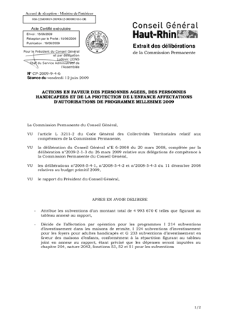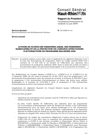 Le présent rapport a pour objet, suite à l’application du règlement financier et sur la base des autorisations de programme votées au budget primitif 2009 d’un montant de 15 835 060 €, de décider de l’affectation par opération des autorisations de programme millésime 2009, dans le cadre des actions en faveur des personnes âgées, des personnes handicapées et de la protection de l’enfance.