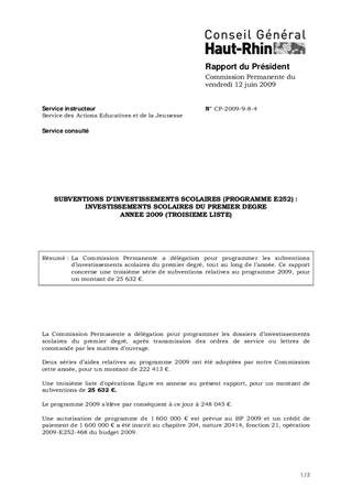 La Commission Permanente a délégation pour programmer les subventions d’investissements scolaires du premier degré, tout au long de l’année. Ce rapport concerne une troisième série de subventions relatives au programme 2009, pour un montant de 25 632 €.