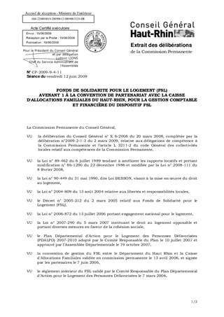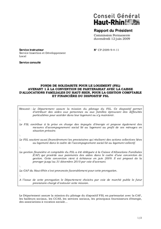 Le Département assure la mission du pilotage du FSL. Ce dispositif permet d’attribuer des aides aux personnes ou aux familles éprouvant des difficultés particulières pour accéder dans leur logement ou s’y maintenir. Le FSL contribue à la prise en charge des impayés d’énergie et propose également des mesures d’accompagnement social lié au logement au profit de ces ménages en situation précaire. Le FSL soutient aussi financièrement les prestataires qui réalisent des actions collectives liées au logement dans le cadre de l’accompagnement social lié au logement collectif. La gestion financière et comptable du FSL a été déléguée à la Caisse d'Allocations Familiales (CAF) qui procède aux paiements des aides dans le cadre d’une convention de gestion. Cette convention vient à échéance en juin 2009. Il est proposé de la proroger jusqu’au 31 décembre 2010 par voie d’avenant. La CAF du Haut-Rhin s’est prononcée favorablement pour cette prorogation. A l’issue de cette prorogation le Département choisira par voie de marché public le futur prestataire chargé d’exécuter cette mission.