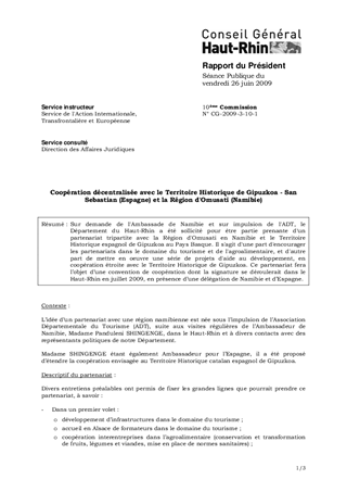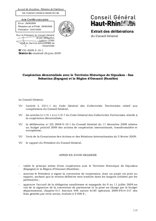 Sur demande de l'Ambassade de Namibie et sur impulsion de l'ADT, le Département du Haut-Rhin a été sollicité pour être partie prenante d'un partenariat tripartite avec la Région d'Omusati en Namibie et le Territoire Historique espagnol de Gipuzkoa au Pays Basque. Il s'agit d'une part d'encourager les partenariats dans le domaine du tourisme et de l'agroalimentaire, et d'autre part de mettre en oeuvre une série de projets d'aide au développement, en coopération étroite avec le Territoire Historique de Gipuzkoa. Ce partenariat fera l’objet d’une convention de coopération dont la signature se déroulerait dans le Haut-Rhin en juillet 2009, en présence d’une délégation de Namibie et d’Espagne.