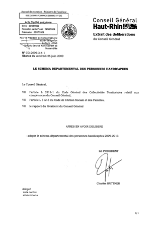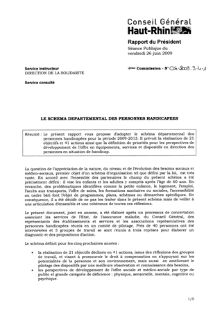 LE SCHEMA DEPARTEMENTAL DES PERSONNES HANDICAPEES Resumé Pièces jointes DELIBERATION RAPPORT Assemblée : Conseil General Date : 26/06/2009 Rapporteur : Non défini Collectivité : Conseil départemental du Haut-Rhin Direction : Non défini Service : Direction Générale Adjointe de la Solidarité, Culture, Patrimoine, Education, Sport et Jeunesse Domaine : Handicap Commission : Assemblée Départementale