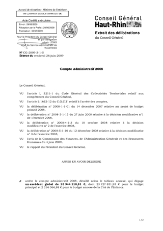 L’exercice 2008 du compte administratif fait apparaître au budget principal (mouvements réels et d’ordre) des dépenses à hauteur de 933,1 M€ et des ressources d’un montant de 956,8M€ pour obtenir un résultat excédentaire cumulé brut de 23,7M€ représentant 2,5 % du volume budgétaire. Le recours à l’emprunt a été porté à hauteur de 80 M€, avec un niveau d’endettement par habitant de 422,26 € en augmentation de 24,9 %. Dans le même temps, le Département a maintenu ses efforts d’investissement à hauteur de 286 M€. Le volume des dépenses de fonctionnement de 471,6 M€ est en augmentation de 7,47 % avec notamment un accroissement de 18,9 % des charges de personnel (+ 14,2 M€) et de 4 % des dépenses sociales de RMI et d’APA (+ 3,8 M€). Ces dépenses ont été financées grâce à une augmentation des taux d’imposition de 2,9%. Les recettes de fonctionnement de 620,6 M€ en augmentation de 4,7 % en excluant la reprise sur provisions de 45,7 M€ constatée en 2007. Les recettes d’investissement, qui sont directement consécutives à la réalisation effective des investissements, ont cette année connu une augmentation de 13,6 % (160,7 M€).