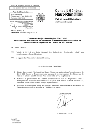 Dans le cadre du Contrat de Projets Etat/Région 2007/2013, il est proposé d'allouer une subvention d'investissement de 2 250 000 € à l'Université de Haute-Alsace pour la restructuration de l'Ecole Nationale Supérieure de Chimie de MULHOUSE. Il est également demandé d'approuver la convention fixant les modalités de versement de la subvention départementale et de m'autoriser à la signer.