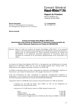 Contrat de Projets Etat/Région 2007/2013 Construction d'un Institut de Recherche et extension/restructuration de l'Ecole Nationale Supérieure de Chimie de MULHOUSE