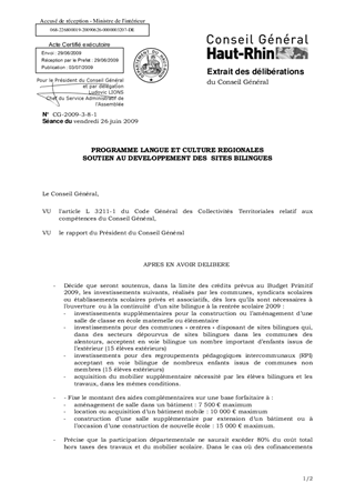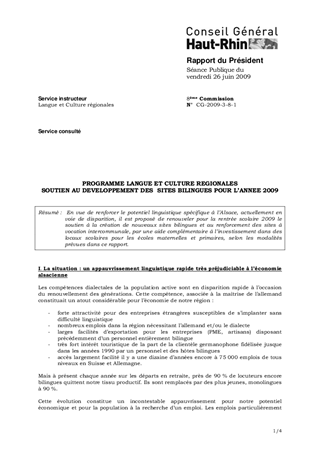 En vue de renforcer le potentiel linguistique spécifique à l’Alsace, actuellement en voie de disparition, il est proposé de confirmer en 2009 le soutien à la création de nouveaux sites bilingues et au renforcement des sites à vocation intercommunale à l’occasion d’une aide complémentaire à l’investissement dans des locaux scolaires pour les écoles maternelles et primaires selon les modalités prévues dans ce rapport. De nouvelle règles interviendront pour les exercices suivants.