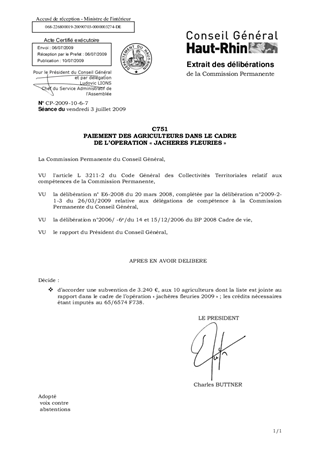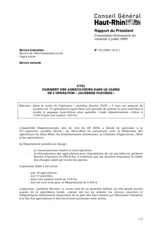 Dans le cadre de l’opération « jachères fleuries 2009 », il vous est proposé de soutenir les 10 agriculteurs ayant fleuri une parcelle de jachère et ainsi contribué à rendre le paysage haut-rhinois plus agréable. L’aide départementale s’élève à 3.240 € pour une surface 10,8 ha.