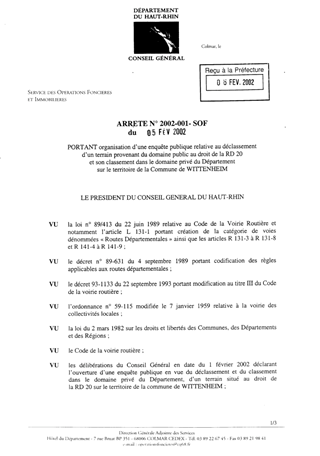 Portant organisation d'une enquête publique relative au déclassement d'un terrain provenant du domaine public au droit de la RD20 et son classement dans le domaine privé du Département sur le territoire de la commune de WITTENHEIM Resumé Pièces jointes ARRETE Assemblée : Non défini Date : 06/02/2002 Rapporteur : Non défini Collectivité : Conseil départemental du Haut-Rhin Direction : Non défini Service : Service du Patrimoine et du droit des Sols Domaine : Déclassement de voirie Commission :
