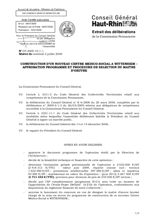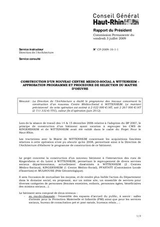 La Direction de l’Architecture a établi le programme des travaux concernant la construction d’un nouveau Centre Médico-Social à WITTENHEIM. Le montant prévisionnel de cette opération est estimé à 2 022 000 €/HT, soit 2 267 000 €/HT (2 711 332 €/TTC), valeur fin d’opération (juin 2012).
