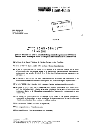 portant fixation des prix de journée hébergement et dépendance 2005 de la section soins de longue durée de l'hôpital intercommunal du Canton Vert. Resumé Pièces jointes ARRETE Assemblée : Non défini Date : 28/01/2005 Rapporteur : Non défini Collectivité : Conseil départemental du Haut-Rhin Direction : Non défini Service : Service de la Tarification des Etablissements Domaine : Prix de Journée Commission :