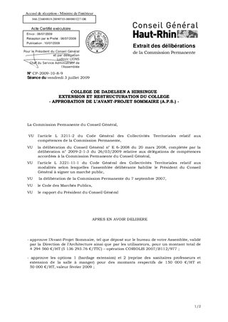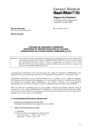 COLLEGE DE DADELSEN A HIRSINGUE EXTENSION ET RESTRUCTURATION DU COLLEGE - APPROBATION DE L’AVANT-PROJET SOMMAIRE (A.P.S.) -