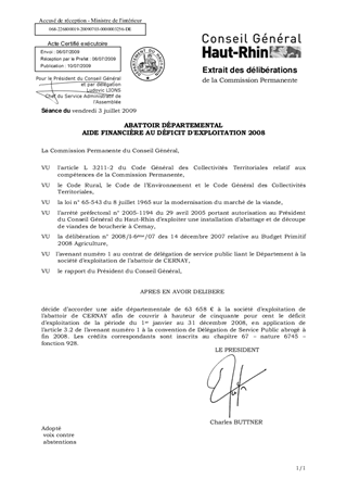 L'exploitation de l'abattoir départemental de CERNAY est assurée par une société composée principalement d'éleveurs, de fermiers-aubergistes, de bouchers et de particuliers haut-rhinois. Par l'avenant numéro 1 au contrat de Délégation de Service Public (DSP), le Département a décidé de soutenir la société à hauteur de 50 % du déficit d'exploitation constaté pour l'année antérieure. Il vous est ainsi proposé d'apporter à la société d'exploitation une aide de 63 658 € pour couvrir le déficit constaté de 127 316 € pour l'année 2008.