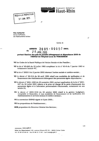 portant fixation des prix de journée hébergement et dépendance 2005 de l'EHPAD de l'hôpital local de TURCKHEIM. Resumé Pièces jointes ARRETE Assemblée : Non défini Date : 28/01/2005 Rapporteur : Non défini Collectivité : Conseil départemental du Haut-Rhin Direction : Non défini Service : Service de la Tarification des Etablissements Domaine : Organisation Interne Commission :