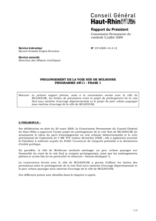 Le présent rapport précise, suite à la concertation menée avec la ville de MULHOUSE, les limites de prestations entre le projet de prolongement de la voie Sud sous maîtrise d'ouvrage départementale et le projet de parc urbain paysager sous maîtrise d'ouvrage de la ville de MULHOUSE.