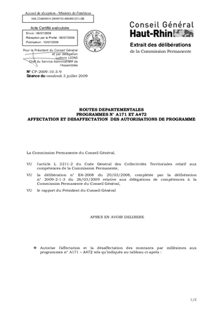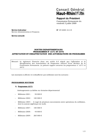 Le règlement Financier dans son article 6.6 stipule que l'affectation et la désaffectation des Autorisations de Programme relèvent d'une décision de la Commission Permanente. Le présent rapport concerne les programmes n° A171 et A472.