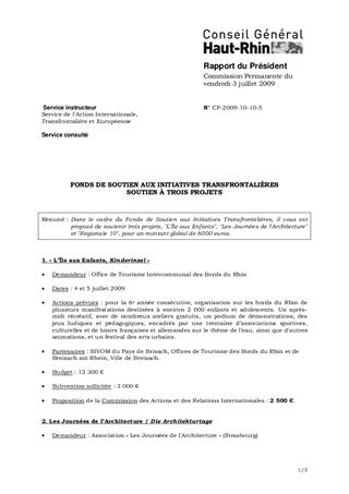 Dans le cadre du Fonds de Soutien aux Initiatives Transfrontalières, il vous est proposé de soutenir trois projets, "L'Île aux Enfants", "Les Journées de l'Architecture" et "Regionale 10", pour un montant global de 6000 euros.