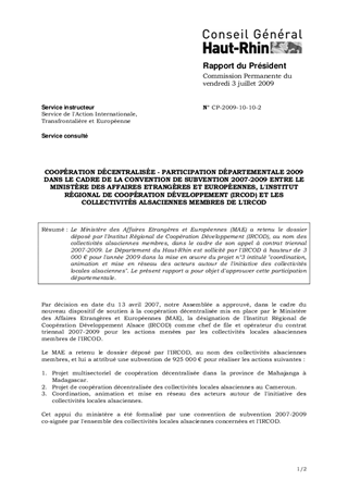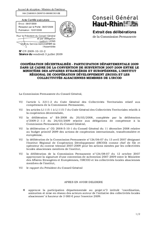 COOPÉRATION DÉCENTRALISÉE - PARTICIPATION DÉPARTEMENTALE 2009 DANS LE CADRE DE LA CONVENTION DE SUBVENTION 2007-2009 ENTRE LE MINISTÈRE DES AFFAIRES ETRANGÈRES ET EUROPÉENNES, L'INSTITUT RÉGIONAL DE COOPÉRATION DÉVELOPPEMENT (IRCOD) ET LES COLLECTIVITÉS A