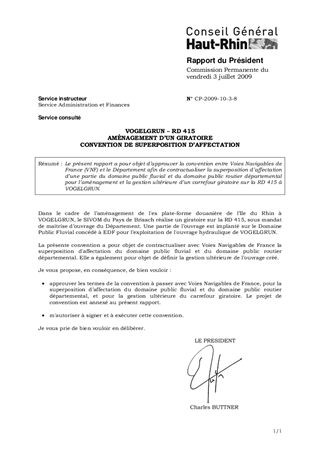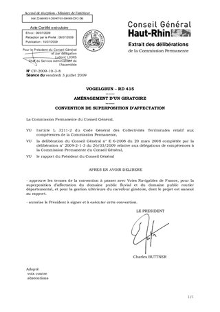 Le présent rapport a pour objet d’approuver la convention entre Voies Navigables de France (VNF) et le Département afin de contractualiser la superposition d’affectation d’une partie du domaine public fluvial et du domaine public routier départemental pour l’aménagement et la gestion ultérieure d’un carrefour giratoire sur la RD 415 à VOGELGRUN.