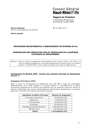 Dans le cadre du programme d’aménagement des rivières 2009 (6 100 000 €), il vous est proposé d’approuver 6 nouveaux programmes de travaux pour un montant total de 1 519 000 € TTC et d'en confier la maîtrise d’ouvrage au Département.