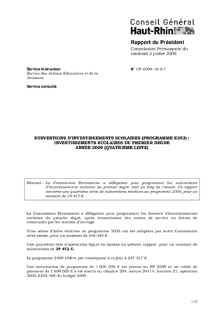 SUBVENTIONS D’INVESTISSEMENTS SCOLAIRES (PROGRAMME E252) : INVESTISSEMENTS SCOLAIRES DU PREMIER DEGRE ANNEE 2009 (QUATRIEME LISTE)