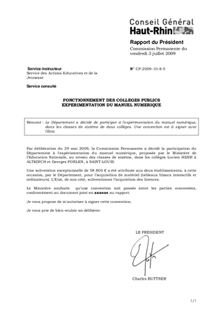 Le Département a décidé de participer à l'expérimentation du manuel numérique, dans les classes de sixième de deux collèges. Une convention est à signer avec l'Etat.