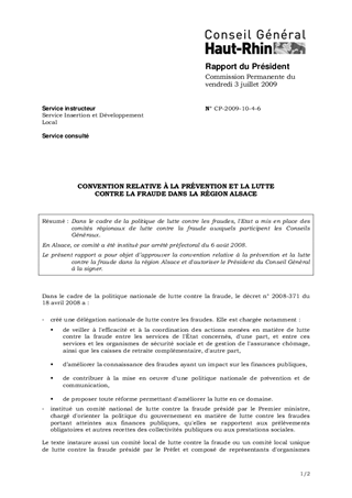 Dans le cadre de la politique de lutte contre les fraudes, l'Etat a mis en place des comités régionaux de lutte contre la fraude auxquels participent les Conseils Généraux. En Alsace, ce comité a été institué par arrêté préfectoral du 6 août 2008. Le présent rapport a pour objet d’approuver la convention relative à la prévention et la lutte contre la fraude dans la région Alsace et d'autoriser le Président du Conseil Général à la signer.