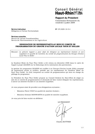 Le présent rapport a pour objet de désigner un représentant titulaire et son suppléant en qualité de membres du comité de programmation du Groupe d’Action Local Thur et Doller