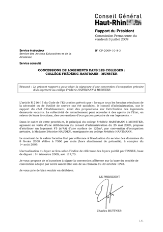 Le présent rapport a pour objet la signature d'une convention d'occupation précaire d'un logement au collège Frédéric HARTMANN à MUNSTER.
