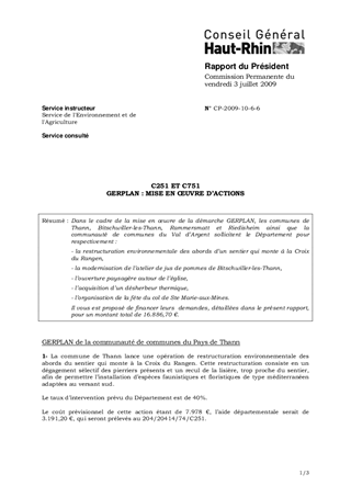 Dans le cadre de la mise en œuvre de la démarche GERPLAN, les communes de Thann, Bitschwiller-les-Thann, Rammersmatt et Riedisheim ainsi que la communauté de communes du Val d’Argent sollicitent le Département pour respectivement : - la restructuration environnementale des abords d’un sentier qui monte à la Croix du Rangen, - la modernisation de l’atelier de jus de pommes de Bitschwiller-les-Thann, - l’ouverture paysagère autour de l’église, - l’acquisition d’un désherbeur thermique, - l’organisation de la fête du col de Ste Marie-aux-Mines. Il vous est proposé de financer leurs demandes, détaillées dans le présent rapport, pour un montant total de 16.886,70 €.