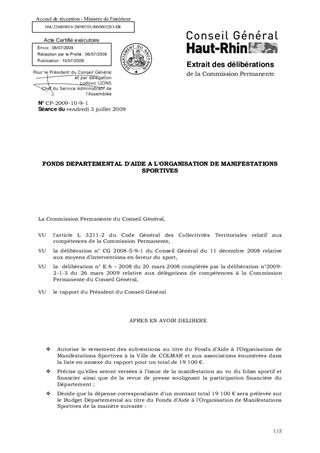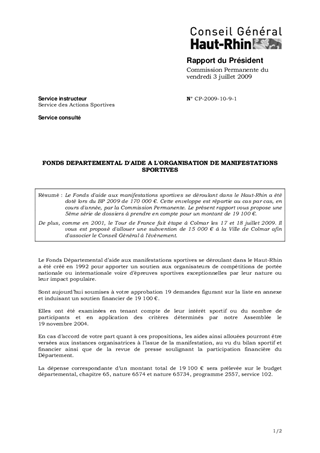 Le Fonds d'aide aux manifestations sportives se déroulant dans le Haut-Rhin a été doté lors du BP 2009 de 170 000 €. Cette enveloppe est répartie au cas par cas, en cours d'année, par la Commission Permanente. Le présent rapport vous propose une 5ème série de dossiers à prendre en compte pour un montant de 19 100 €. De plus, comme en 2001, le Tour de France fait étape à Colmar les 17 et 18 juillet 2009. Il vous est proposé d'allouer une subvention de 15 000 € à la Ville de Colmar afin d'associer le Conseil Général à l'évènement.