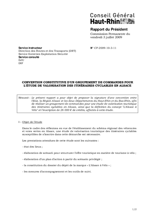 CONVENTION CONSTITUTIVE D'UN GROUPEMENT DE COMMANDES POUR L'ÉTUDE DE VALORISATION DES ITINÉRAIRES CYCLABLES EN ALSACE