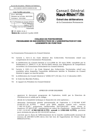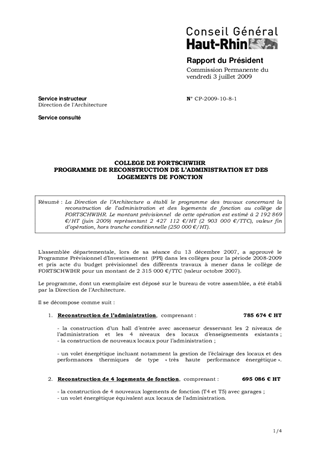 La Direction de l’Architecture a établi le programme des travaux concernant la reconstruction de l’administration et des logements de fonction au collège de FORTSCHWIHR. Le montant prévisionnel de cette opération est estimé à 2 192 869 €/HT (juin 2009) représentant 2 427 112 €/HT (2 903 000 €/TTC), valeur fin d’opération, hors tranche conditionnelle (250 000 €/HT).