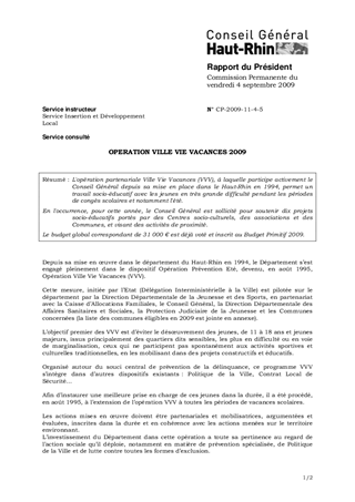 L'opération partenariale Ville Vie Vacances (VVV), à laquelle participe activement le Conseil Général depuis sa mise en place dans le Haut-Rhin en 1994, permet un travail socio-éducatif avec les jeunes en très grande difficulté pendant les périodes de congés scolaires et notamment l'été. En l'occurrence, pour cette année, le Conseil Général est sollicité pour soutenir dix projets socio-éducatifs portés par des Centres socio-culturels, des associations et des Communes, et visant des activités de proximité. Le budget global correspondant de 31 000 € est déjà voté et inscrit au Budget Primitif 2009.