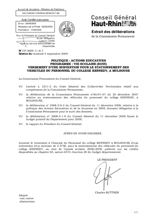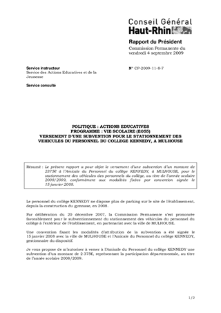 Le présent rapport a pour objet le versement d’une subvention d’un montant de 2375€ à l’Amicale du Personnel du collège KENNEDY, à MULHOUSE, pour le stationnement des véhicules des personnels du collège, au titre de l’année scolaire 2008/2009, conformément aux modalités fixées par convention signée le 15 janvier 2008.
