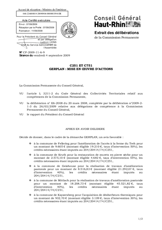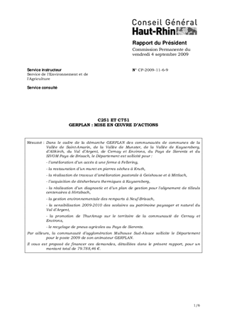 Dans le cadre de la démarche GERPLAN des communautés de communes de la Vallée de Saint-Amarin, de la Vallée de Munster, de la Vallée de Kaysersberg, d’Altkirch, du Val d’Argent, de Cernay et Environs, du Pays de Sierentz et du SIVOM Pays de Brisach, le Département est sollicité pour : - l’amélioration d’un accès à une ferme à Fellering, - la restauration d’un muret en pierres sèches à Kruth, - la réalisation de travaux d’amélioration pastorale à Geishouse et à Mittlach, - l’acquisition de désherbeurs thermiques à Kaysersberg, - la réalisation d’un diagnostic et d’un plan de gestion pour l'alignement de tilleuls centenaires à Hirtzbach, - la gestion environnementale des remparts à Neuf-Brisach, - la sensibilisation 2009-2010 des scolaires au patrimoine paysager et naturel du Val d’Argent, - la promotion de ThurAmap sur le territoire de la communauté de Cernay et Environs, - le recyclage de pneus agricoles au Pays de Sierentz. Par ailleurs, la communauté d’agglomération Mulhouse Sud-Alsace sollicite le Département pour le poste 2009 de son animateur GERPLAN. Il vous est proposé de financer ces demandes, détaillées dans le présent rapport, pour un montant total de 79.788,46 €.