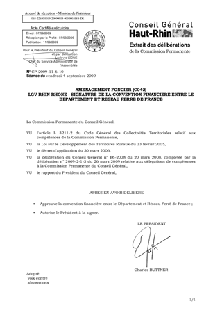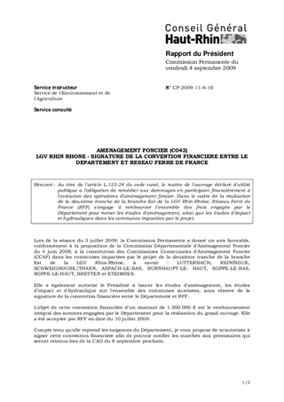 AMENAGEMENT FONCIER (C042) LGV RHIN RHONE - SIGNATURE DE LA CONVENTION FINANCIERE ENTRE LE DEPARTEMENT ET RESEAU FERRE DE FRANCE