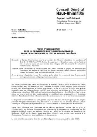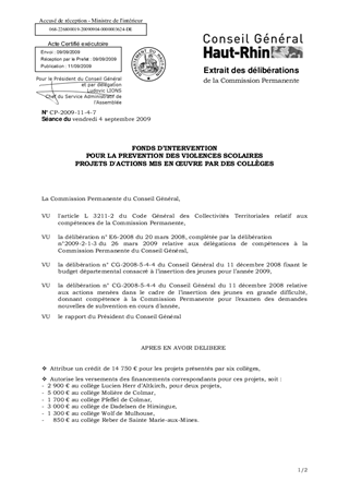 Le Fonds d'Intervention pour la prévention des Violences Scolaires est un dispositif doté de 40 000 € en 2009, destiné à encourager et à soutenir des projets d'actions mis en œuvre dans et aux abords des collèges afin de prévenir les violences scolaires et les incivilités. Dans ce cadre, les collèges d’Altkirch (Herr), de Colmar (Molière et Pfeffel), de Hirsingue (de Dadelsen), de Mulhouse (Wolf) et de Sainte Marie-aux-Mines (Reber), présentent chacun des projets pour un montant total de 14 750 €. Il est proposé d'autoriser, pour les actions présentées, le versement des financements correspondants aux collèges porteurs de projets.