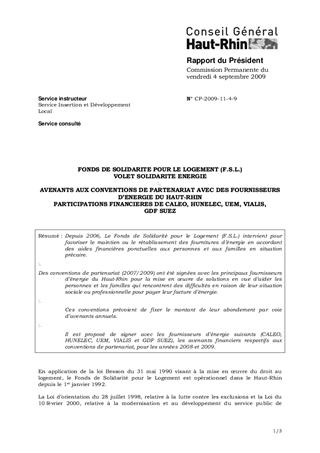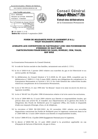 FONDS DE SOLIDARITE POUR LE LOGEMENT (F.S.L.) VOLET SOLIDARITE ENERGIE AVENANTS AUX CONVENTIONS DE PARTENARIAT AVEC DES FOURNISSEURS D’ENERGIE DU HAUT-RHIN PARTICIPATIONS FINANCIERES DE CALEO, HUNELEC, UEM, VIALIS, GDF SUEZ