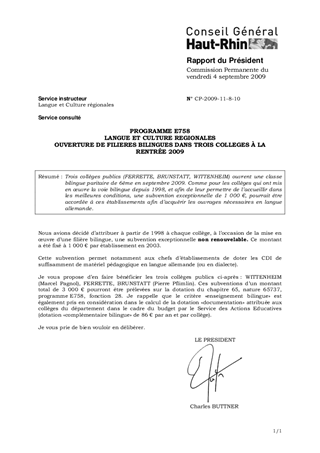 Trois collèges publics (FERRETTE, BRUNSTATT, WITTENHEIM) ouvrent une classe bilingue paritaire de 6ème en septembre 2009. Comme pour les collèges qui ont mis en œuvre la voie bilingue depuis 1998, et afin de leur permettre de l’accueillir dans les meilleures conditions, une subvention exceptionnelle de 1 000 €, pourrait être accordée à ces établissements afin d’acquérir les ouvrages nécessaires en langue allemande.