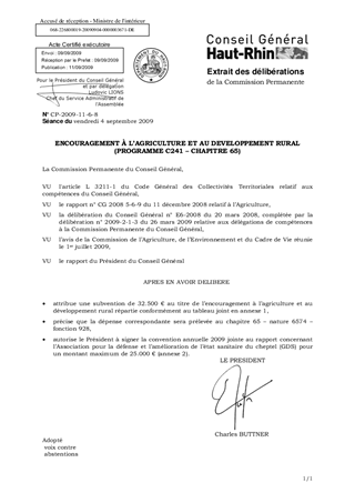 Dans le cadre du Budget Primitif 2009, un montant de 146.000 € a été inscrit au titre de l’encouragement à l’agriculture et au développement rural (rapport CG 2008 5-6-9). Il vous est proposé de prélever 32.500 € sur ces crédits pour soutenir les actions envisagées pour 2009 par les organismes récapitulés dans le tableau ci-joint (annexe 1). Pour l’un d’entre eux, l’Association pour la défense et l’amélioration de l’état sanitaire du cheptel (GDS), le montant de la subvention nécessite l’établissement d’une convention de financement conformément au règlement financier départemental (annexe 2)