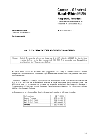 Octroi de garantie d'emprunt intégrale à la S.A. H.L.M. NEOLIA de Montbéliard relative à deux prêts d’un montant de 978 353 €, à souscrire pour l’acquisition-amélioration de 9 logements à Colmar.