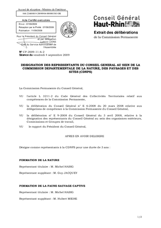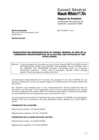 Il vous est proposé de reconduire au sein de cette instance MM. Pierre BIHL, Charles BUTTNER, Michel HABIG, Guy JACQUEY, Hubert MIEHE, Bernard NOTTER, Jean-Luc REITZER, Eric STRAUMANN, François TACQUARD, dans les formations spécialisées suivantes : Nature, Sites et paysages, Publicité, Faune sauvage captive, Unités touristiques nouvelles, Carrières.