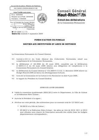 il est proposé : - de valider une convention de partenariat 2009-2012 avec la Ville de Colmar et la Fédération Hiéro Colmar pour la mise en place d’un centre de ressources des Musiques Actuelles, au Grillen à Colmar ; - d'attribuer à la Ville de Colmar, une subvention globale de 58 000 € sur la durée de la convention, dont 10 000 € à allouer en 2009 ; - d’attribuer à la Fédération Hiéro Colmar, une subvention globale de 69 000 € sur la durée de la convention dont 12 000 € en 2009.