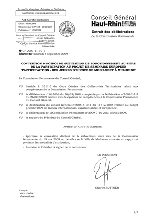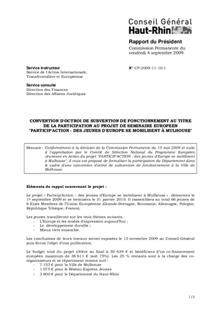 Conformément à la décision de la Commission Permanente du 15 mai 2009 et suite à l'approbation par le Comité de Sélection National du Programme Européen Jeunesse en Action du projet "PARTICIP'ACTION - des jeunes d'Europe se mobilisent à Mulhouse", il vous est proposé de formaliser la participation du Département dans le cadre d'une convention d'octroi de subvention de fonctionnement à la Ville de Mulhouse.