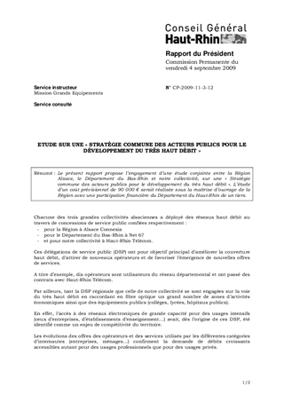 Le présent rapport propose l’engagement d’une étude conjointe entre la Région Alsace, le Département du Bas-Rhin et notre collectivité, sur une « Stratégie commune des acteurs publics pour le développement du très haut débit ». L’étude d’un coût prévisionnel de 90 000 € serait réalisée sous la maîtrise d’ouvrage de la Région avec une participation financière du Département du Haut-Rhin de un tiers.