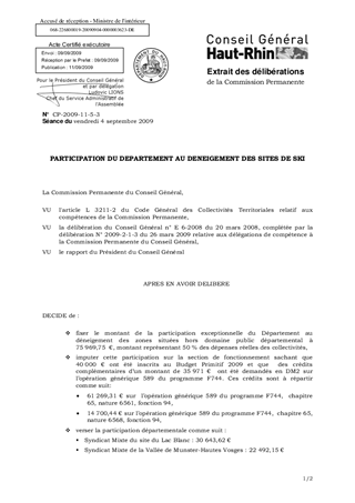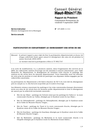 le présent rapport a pour objet de fixer la participation départementale en faveur de chaque collectivité locale ayant assuré le déneigement des sites de ski pendant la saison hivernale 2008/2009. Le montant total de la participation s'élève à 75 969,75 €