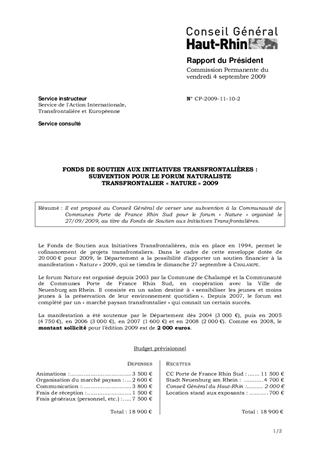 Il est proposé au Conseil Général de verser une subvention à la Communauté de Communes Porte de France Rhin Sud pour le forum « Nature » organisé le 27/09/2009, au titre du Fonds de Soutien aux Initiatives Transfrontalières.