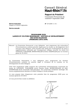 La Commission Permanente a reçu délégation pour programmer des subventions d’investissements scolaires (premier degré) pour un soutien au développement des nouveaux sites bilingues. Cette première liste 2009 pour l’aménagement de locaux supplémentaires nécessités par l’enseignement bilingue concerne les écoles de UFFHOLTZ, TURCKHEIM, MORSCHWILLER LE BAS, GUEBWILLER pour un montant global de 39 300 €.