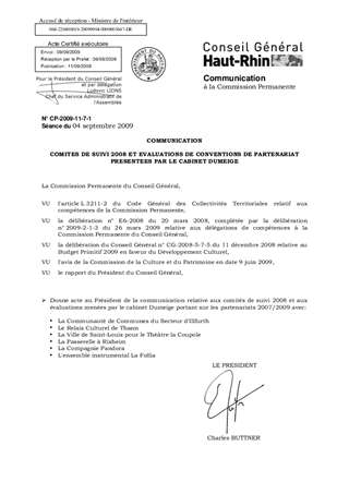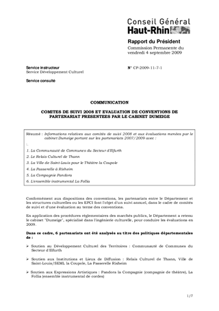 Informations relatives aux comités de suivi 2008 et aux évaluations menées par le cabinet Dumeige portant sur les partenariats 2007/2009 avec : 1. La Communauté de Communes du Secteur d'Illfurth 2. Le Relais Culturel de Thann 3. La Ville de Saint-Louis pour le Théâtre la Coupole 4. La Passerelle à Rixheim 5. La Compagnie Pandora 6. L'ensemble instrumental La Follia